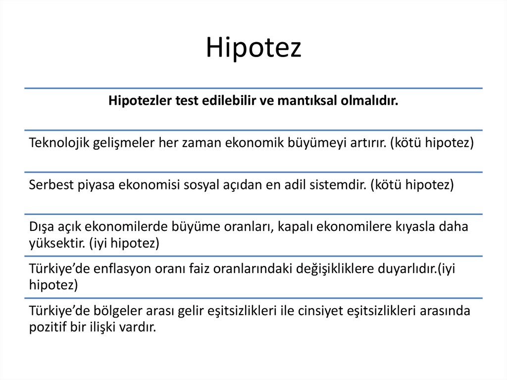 Hipotezler test edilebilir ve mantıksal olmalıdır.Teknolojik gelişmeler her zaman ekonomik büyümeyi artırır. (kötü hipotez)