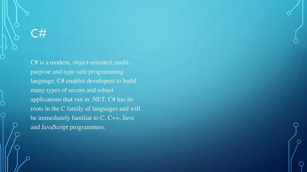 C# is a modern, object-oriented, multipurpose and type-safe programminglanguage. C# enables developers to build