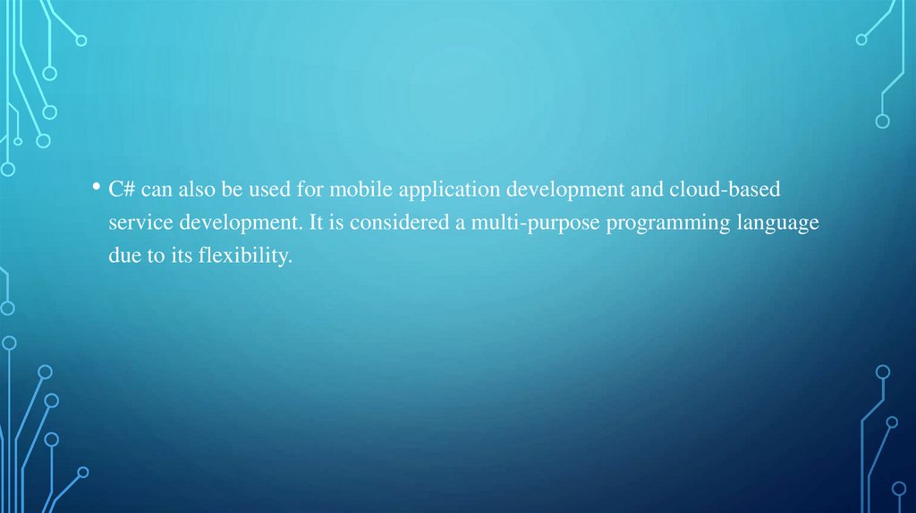 • C# can also be used for mobile application development and cloud-basedservice development. It is considered a multi-purpose programming language