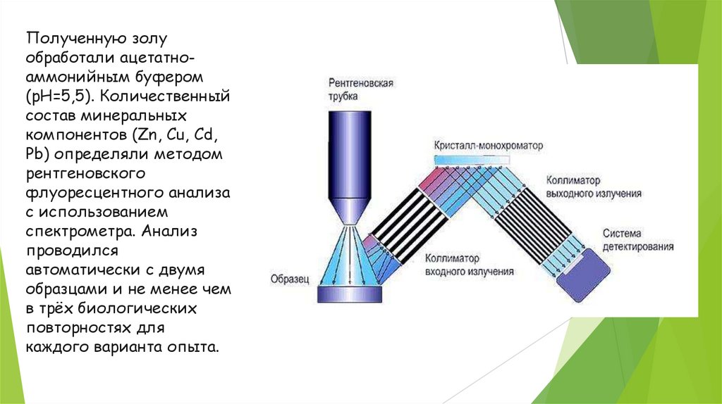 11. Полученную золу обработали ацетатно-аммонийным буфером (pH=5,5). Количественный состав минеральных компонентов (Zn, Cu, Cd, Pb)