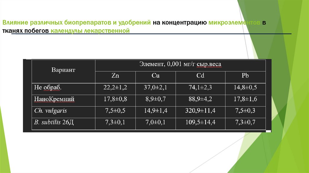 14. Влияние различных биопрепаратов и удобрений на концентрацию микроэлементов в тканях побегов календулы лекарственной