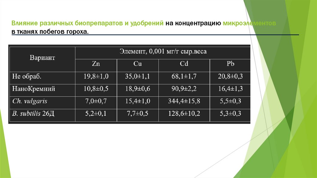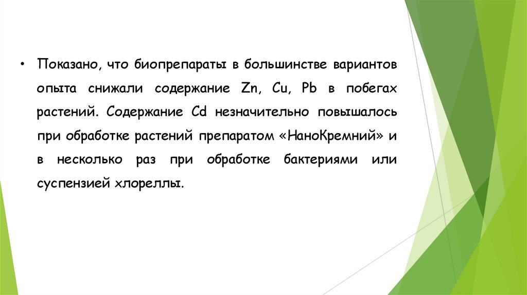24. Показано, что биопрепараты в большинстве вариантов опыта снижали содержание Zn, Cu, Pb в побегах растений. Содержание Сd