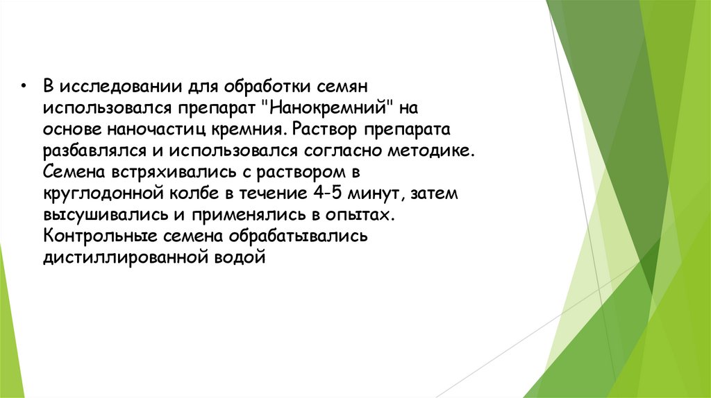 7. В исследовании для обработки семян использовался препарат "Нанокремний" на основе наночастиц кремния. Раствор препарата