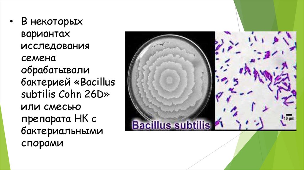 8. В некоторых вариантах исследования семена обрабатывали бактерией «Bacillus subtilis Cohn 26D» или смесью препарата НК с