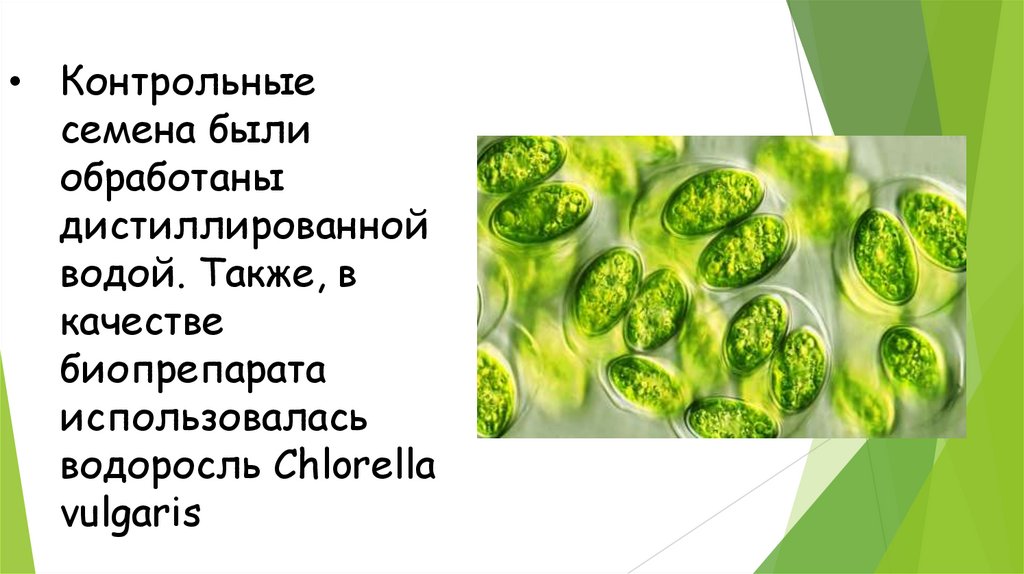 9. Контрольные семена были обработаны дистиллированной водой. Также, в качестве биопрепарата использовалась водоросль Chlorella