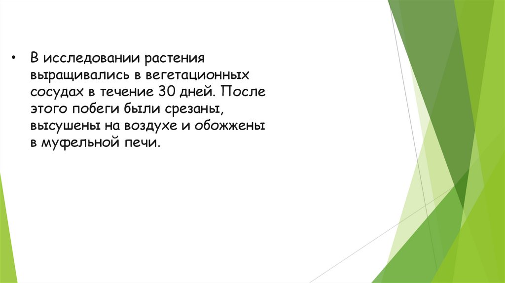10. В исследовании растения выращивались в вегетационных сосудах в течение 30 дней. После этого побеги были срезаны, высушены на