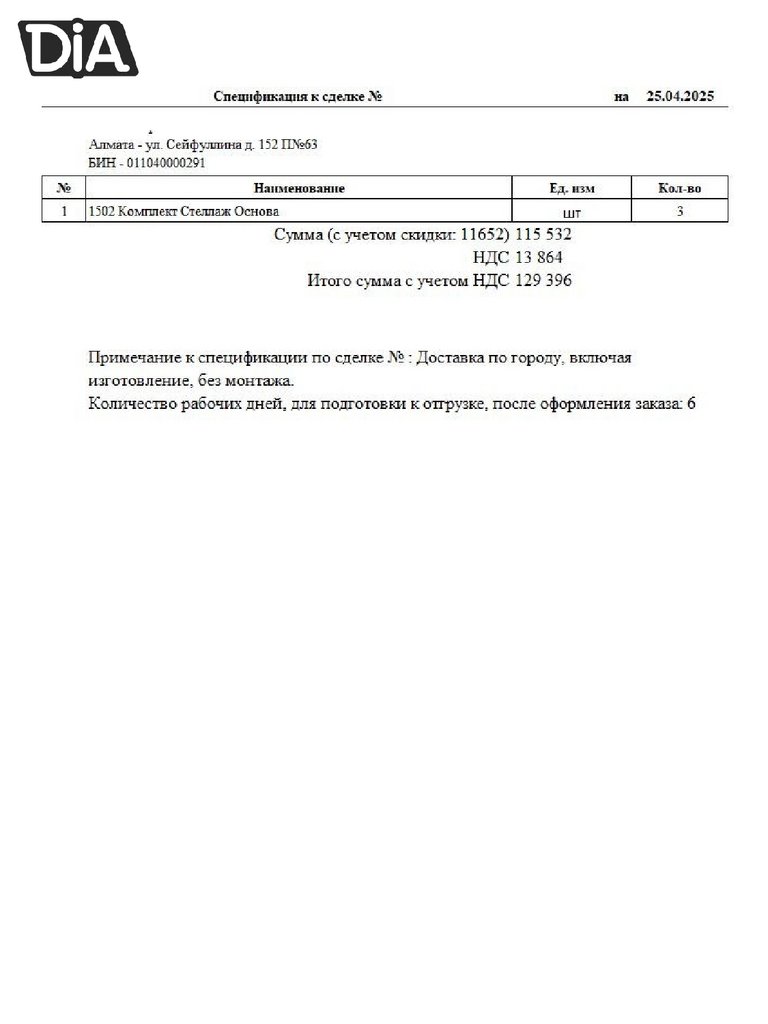 Количество рабочих дней, для подготовки к отгрузке, после оформления заказа: 6