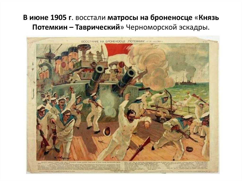 13. В июне 1905 г. восстали матросы на броненосце «Князь Потемкин – Таврический» Черноморской эскадры.