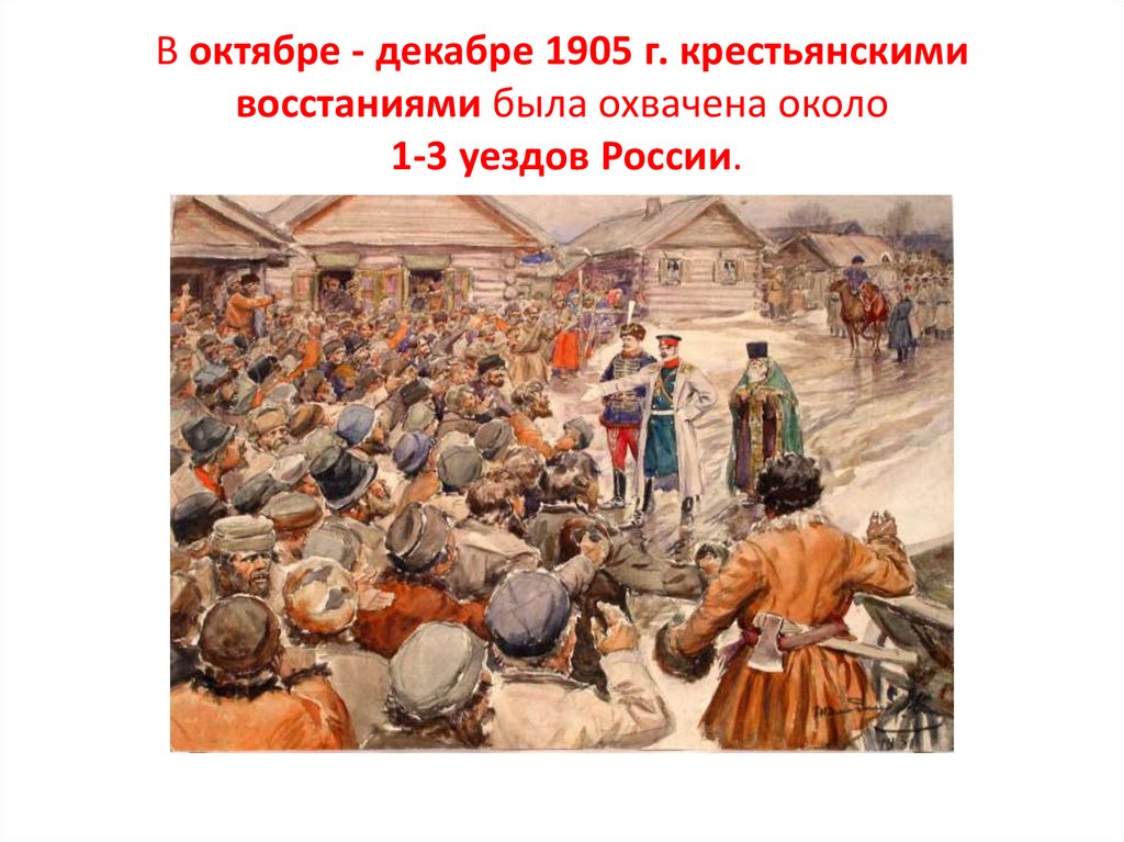 21. В октябре - декабре 1905 г. крестьянскими восстаниями была охвачена около 1-3 уездов России.