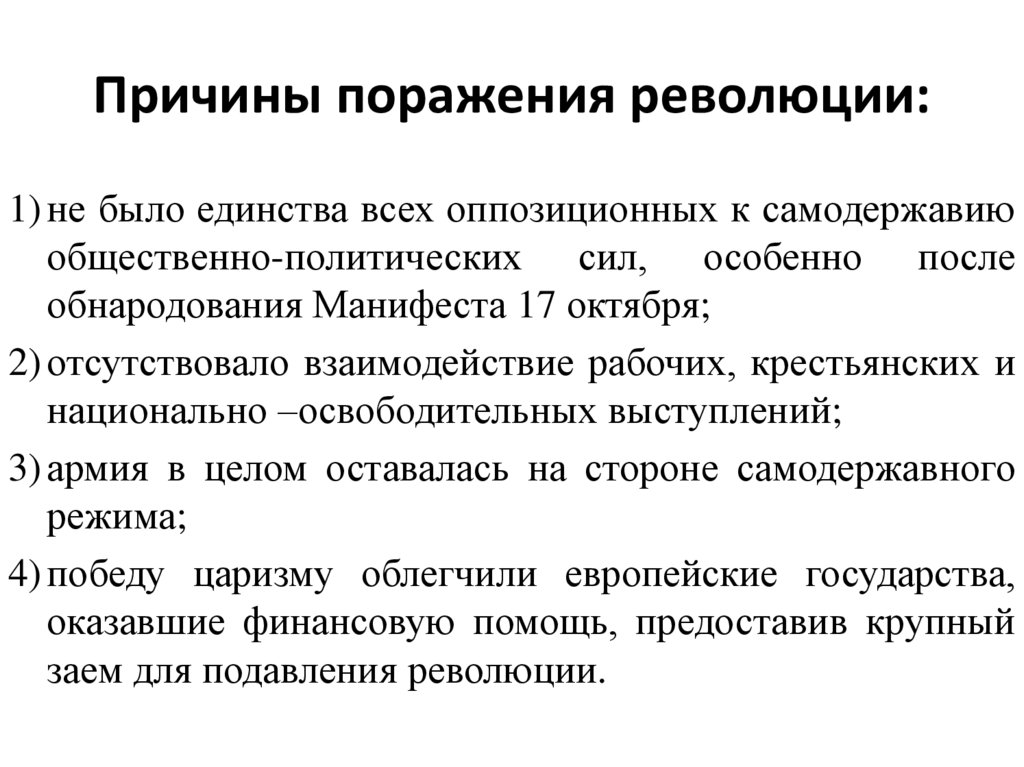 1) не было единства всех оппозиционных к самодержавиюобщественно-политических сил, особенно после