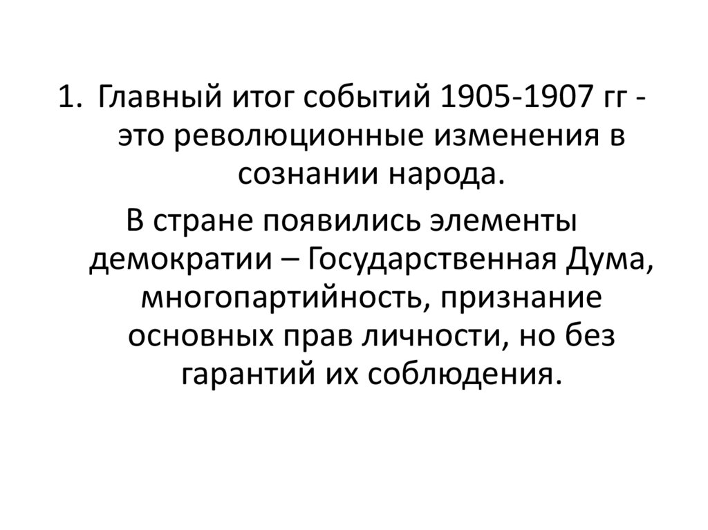 1. Главный итог событий 1905-1907 гг это революционные изменения всознании народа.