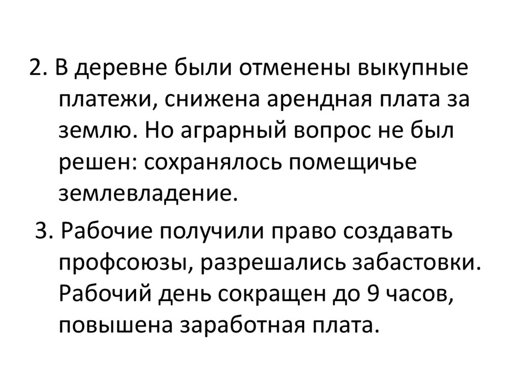 2. В деревне были отменены выкупныеплатежи, снижена арендная плата за