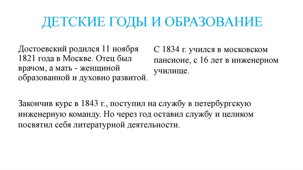 Достоевский родился 11 ноябряС 1834 г. учился в московском