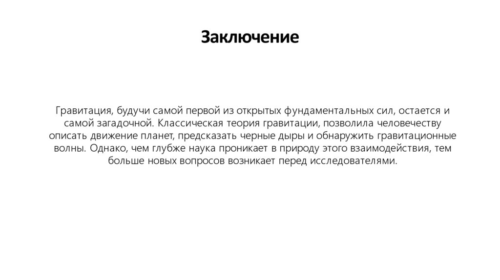 ЗаключениеГравитация, будучи самой первой из открытых ф ундаментальных сил, остается и