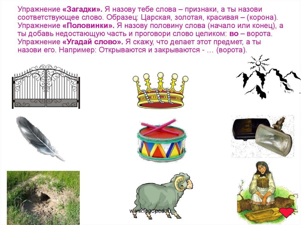 Упражнение «Загадки». Я назову тебе слова – признаки, а ты назовисоответствующее слово. Образец: Царская, золотая, красивая – (корона).