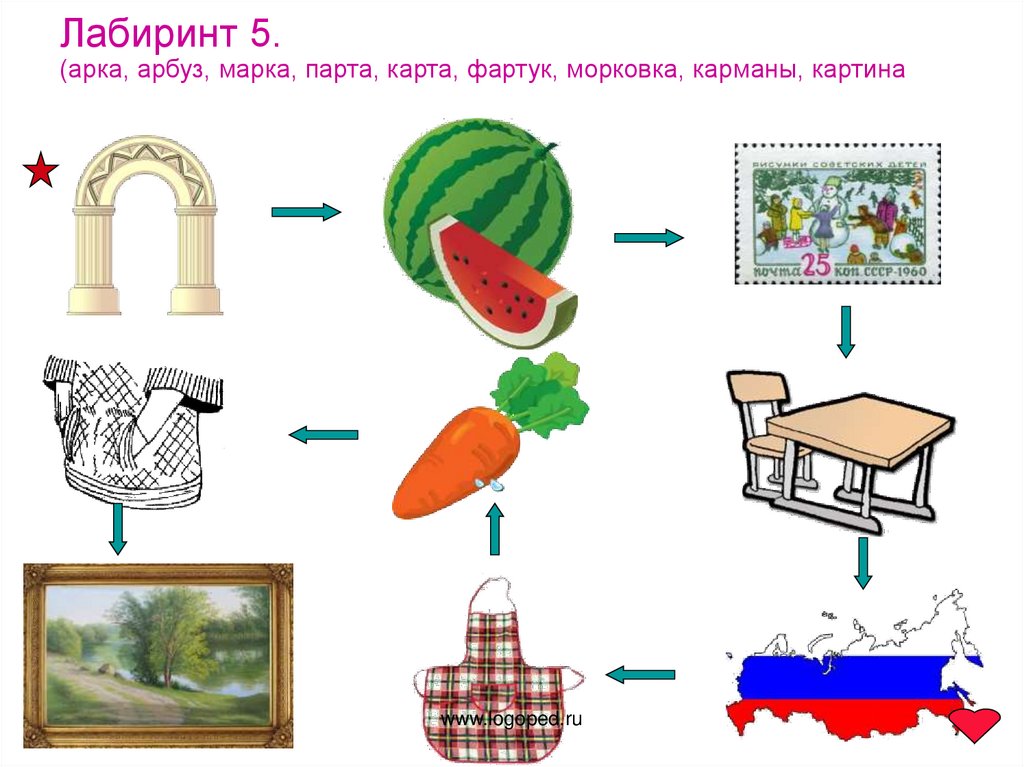 Лабиринт 5.(арка, арбуз, марка, парта, карта, фартук, морковка, карманы, картина