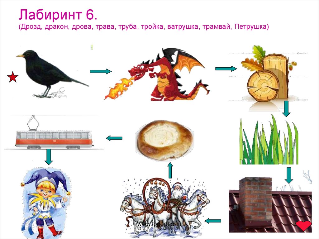 Лабиринт 6.(Дрозд, дракон, дрова, трава, труба, тройка, ватрушка, трамвай, Петрушка)