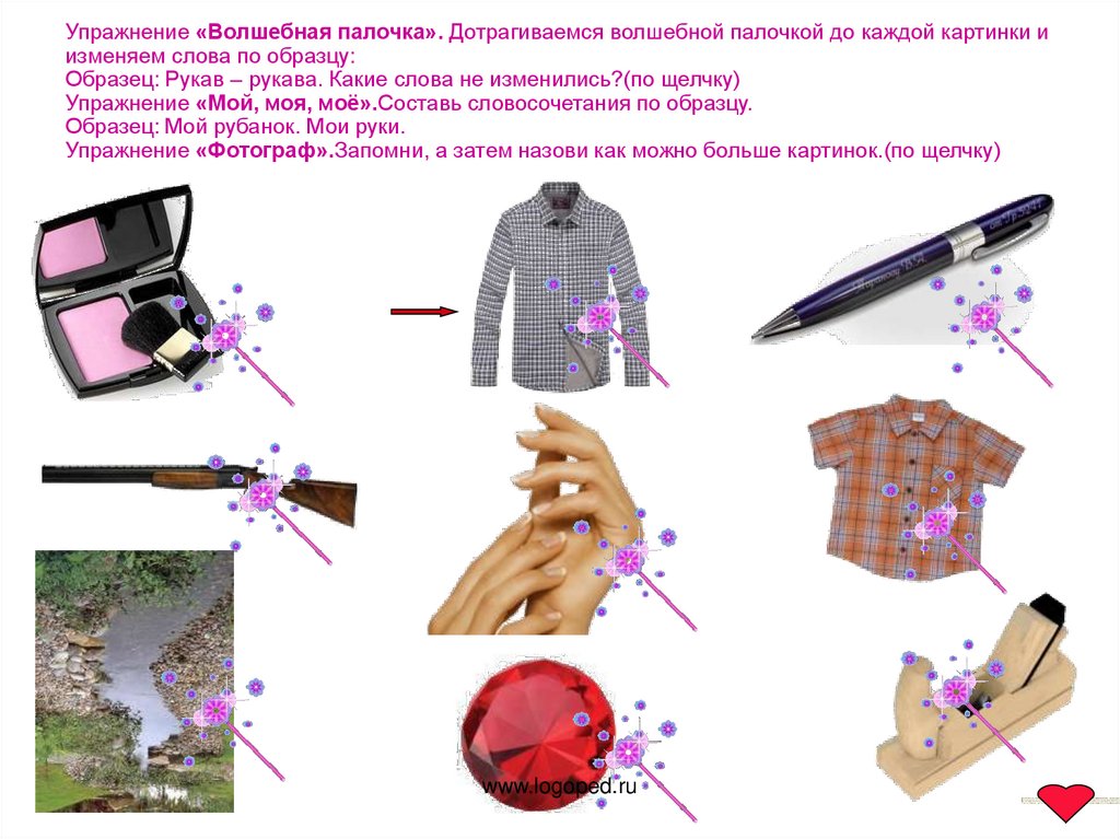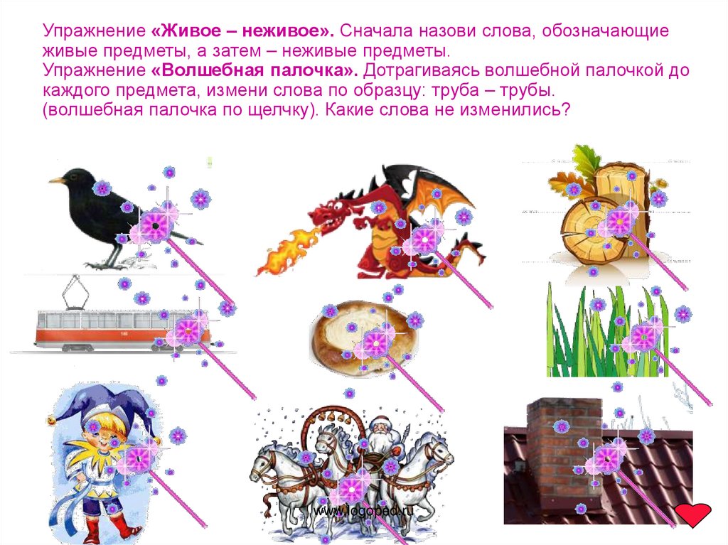 Упражнение «Волшебная палочка». Дотрагиваемся волшебной палочкой до каждой картинки иизменяем слова по образцу: