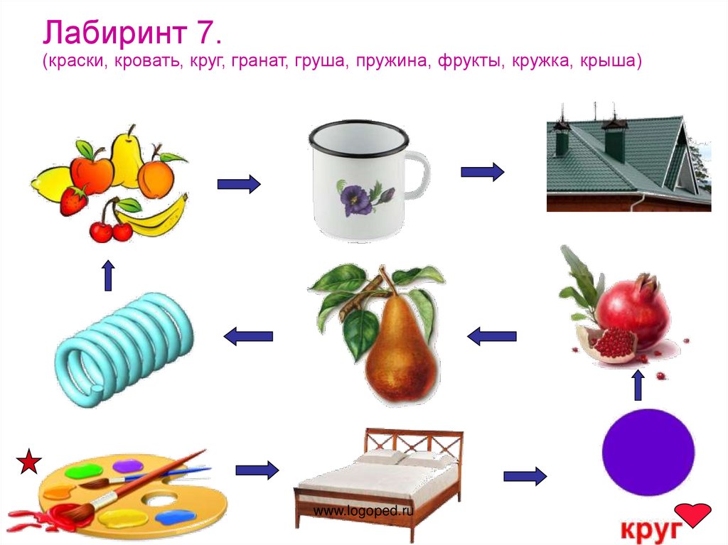 Лабиринт 7.(краски, кровать, круг, гранат, груша, пружина, фрукты, кружка, крыша)