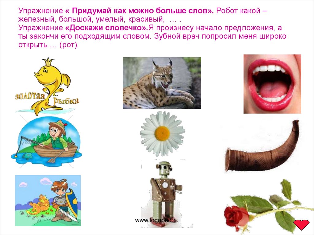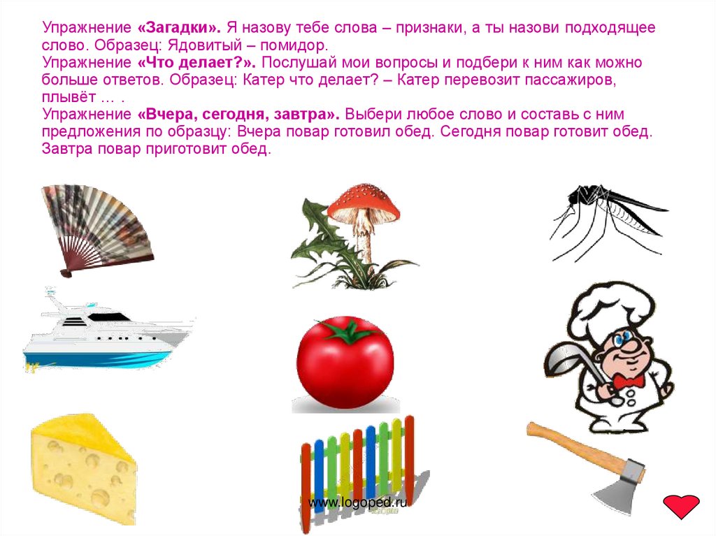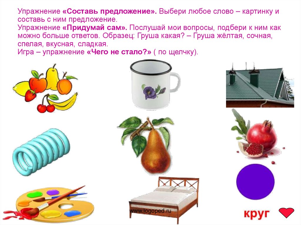 Упражнение «Составь предложение». Выбери любое слово – картинку исоставь с ним предложение.