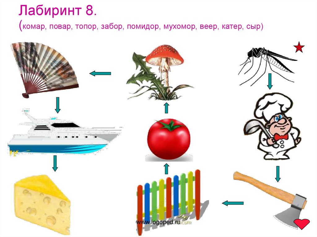 Лабиринт 8.(комар, повар, топор, забор, помидор, мухомор, веер, катер, сыр)