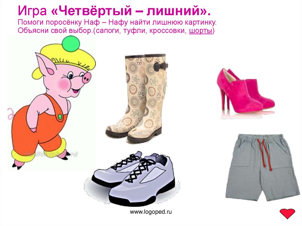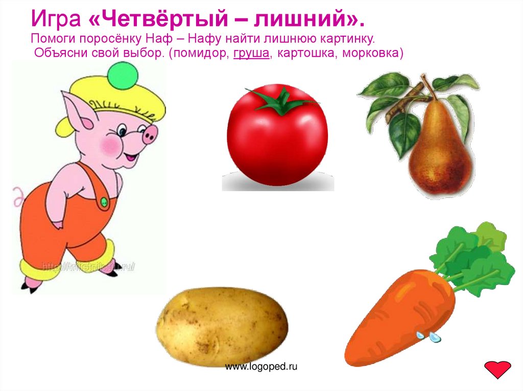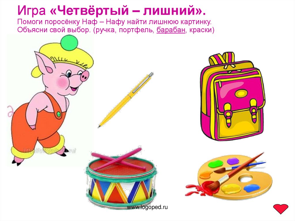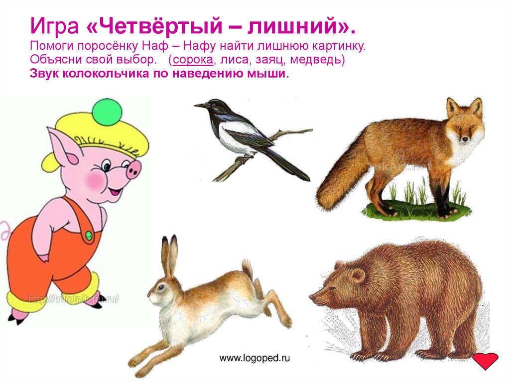 Игра «Четвёртый – лишний».Помоги поросёнку Наф – Нафу найти лишнюю картинку.
