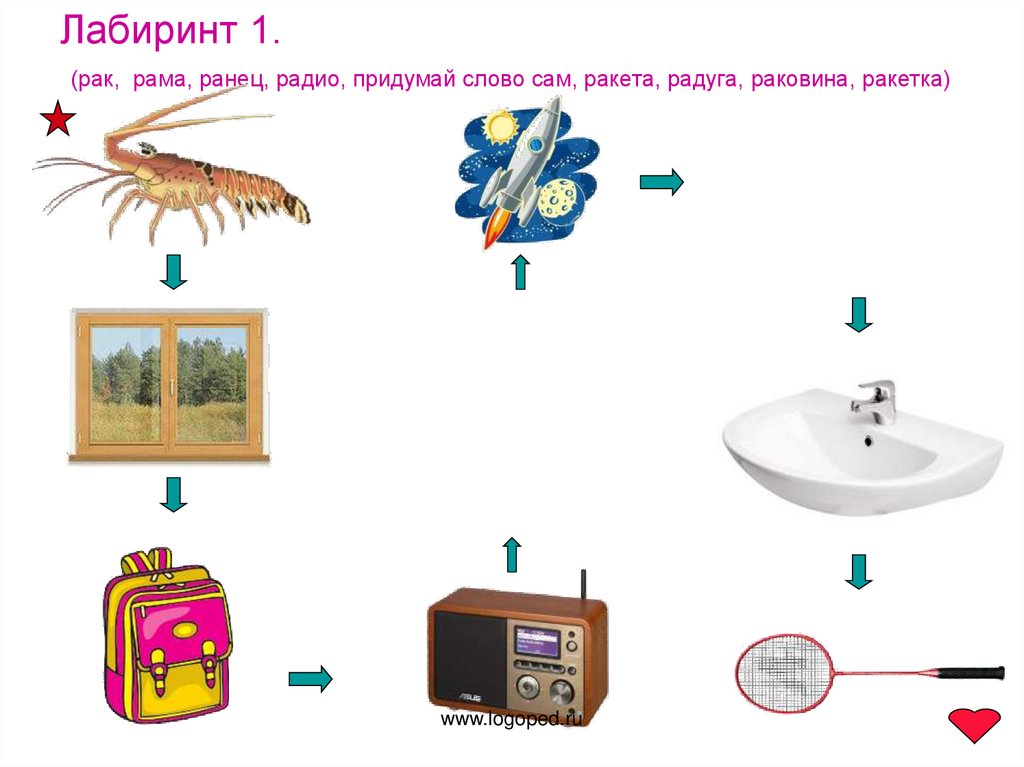 Лабиринт 1.(рак, рама, ранец, радио, придумай слово сам, ракета, радуга, раковина, ракетка)