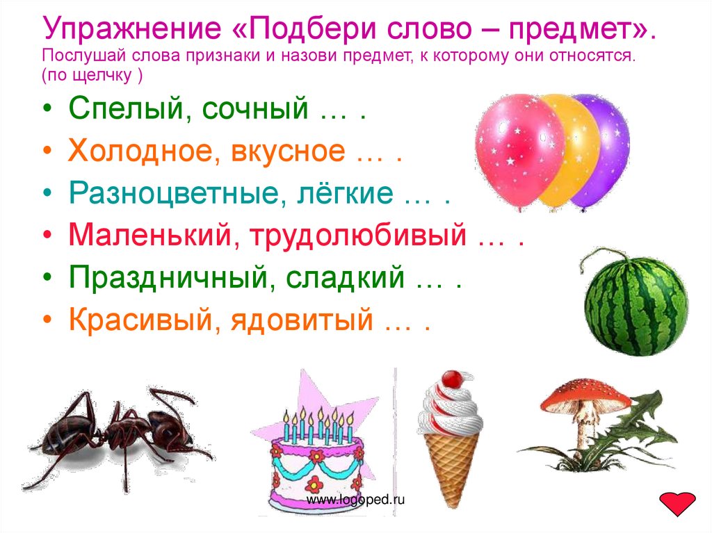 Упражнение «Загадки». Я назову тебе слова – признаки, а ты назови подходящееслово. Образец: Ядовитый – помидор.