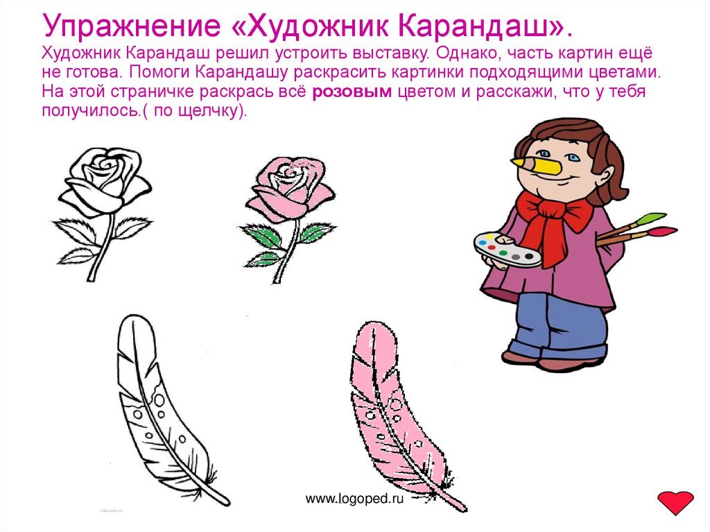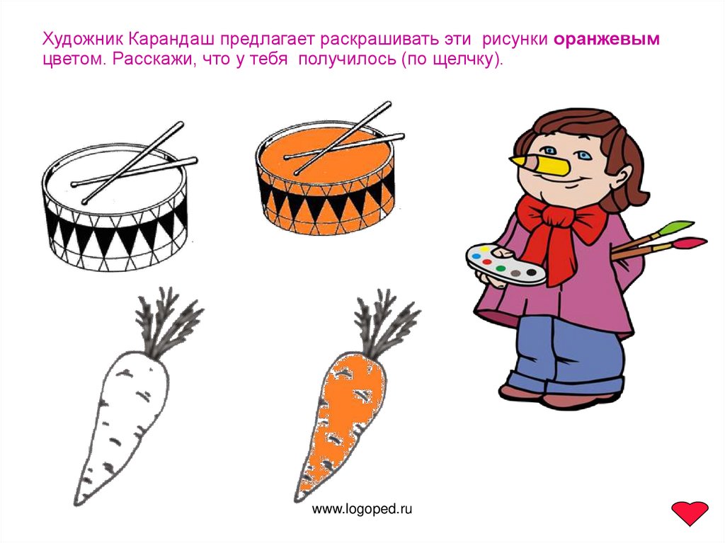 Художник Карандаш предлагает раскрашивать эти рисунки оранжевымцветом. Расскажи, что у тебя получилось (по щелчку).