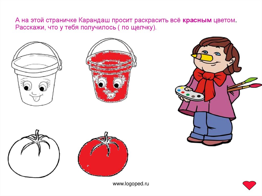 А на этой страничке Карандаш просит раскрасить всё красным цветом.Расскажи, что у тебя получилось ( по щелчку).