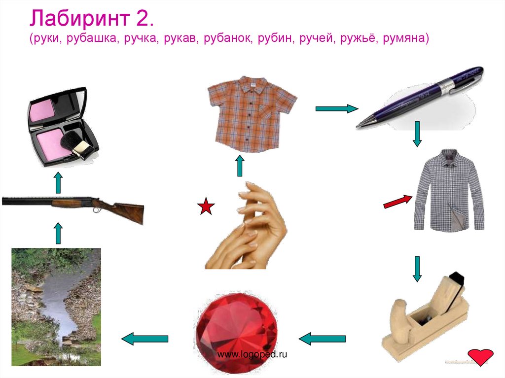 Лабиринт 2.(руки, рубашка, ручка, рукав, рубанок, рубин, ручей, ружьё, румяна)