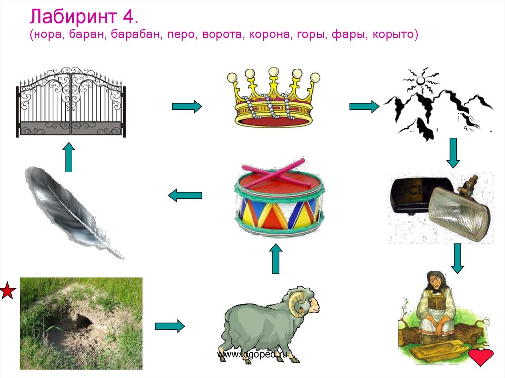 Лабиринт 4.(нора, баран, барабан, перо, ворота, корона, горы, фары, корыто)