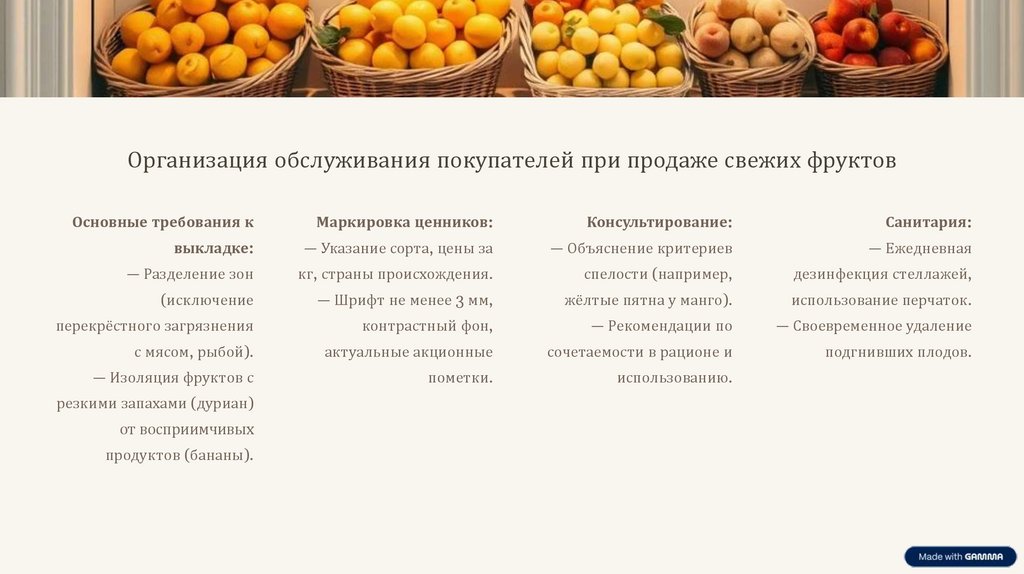 Организация обслуживания покупателей при продаже свежих фруктовОсновные требования к