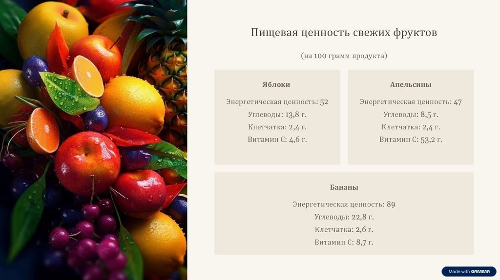 Пищевая ценность свежих фруктов(на 100 грамм продукта)