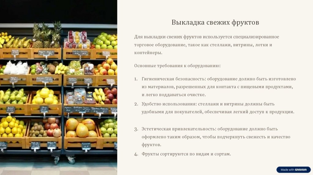 Выкладка свежих фруктовДля выкладки свежих фруктов используется специализированное