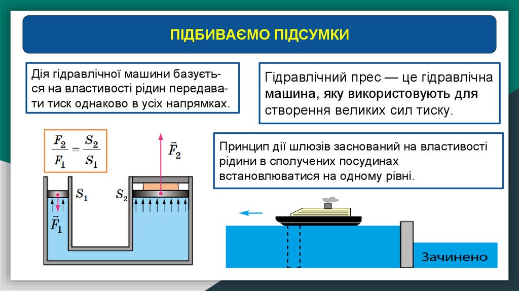 ПІДБИВАЄМО ПІДСУМКИДія гідравлічної машини базується на властивості рідин передавати тиск однаково в усіх напрямках.