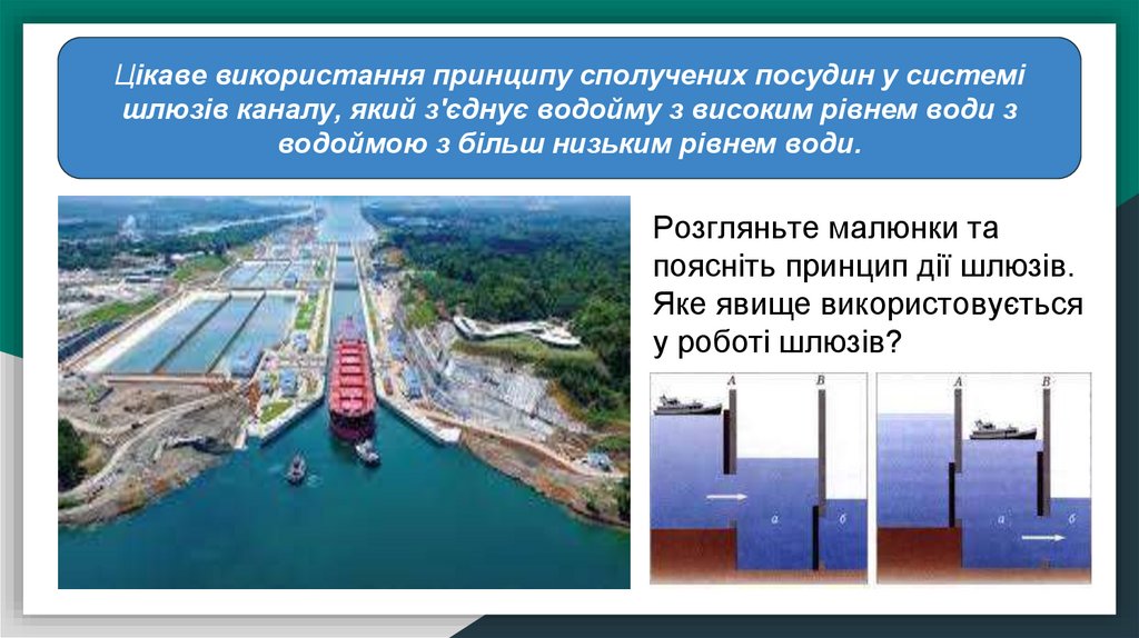 Цікаве використання принципу сполучених посудин у системішлюзів каналу, який з'єднує водойму з високим рівнем води з
