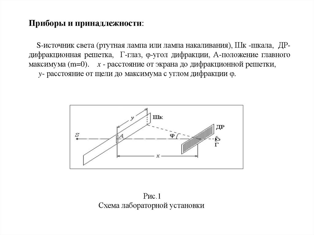 Приборы и принадлежности:S-источник света (ртутная лампа или лампа накаливания), Шк -шкала, ДРдифракционная решетка, Г-глаз, φ-угол дифракции, А-положение главного