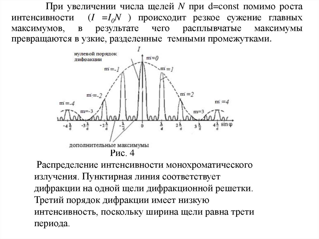 При увеличении числа щелей N при d=const помимо ростаинтенсивности (I =I0N ) происходит резкое сужение главных