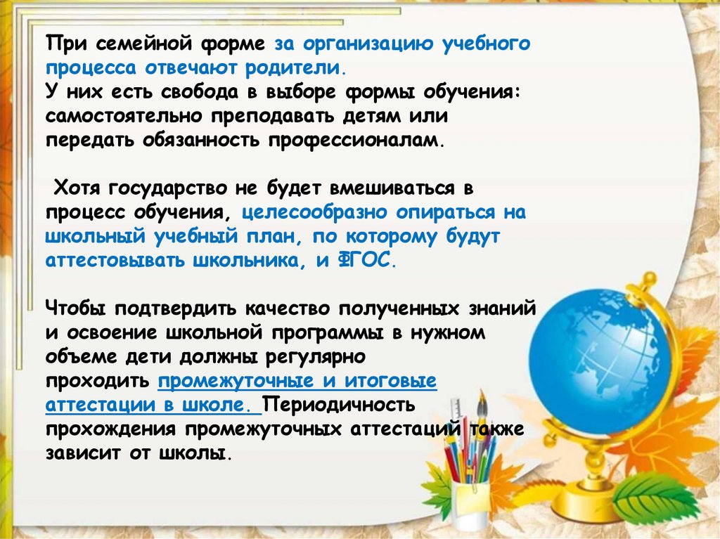 При семейной форме за организацию учебногопроцесса отвечают родители.