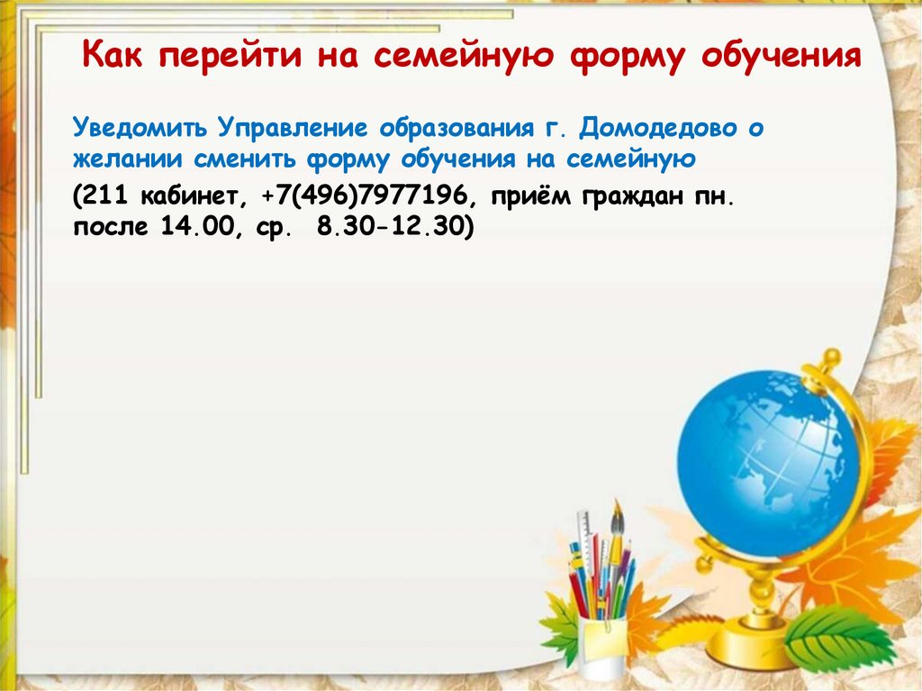 Уведомить Управление образования г. Домодедово ожелании сменить форму обучения на семейную