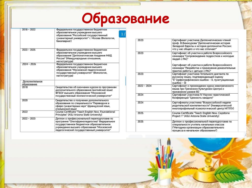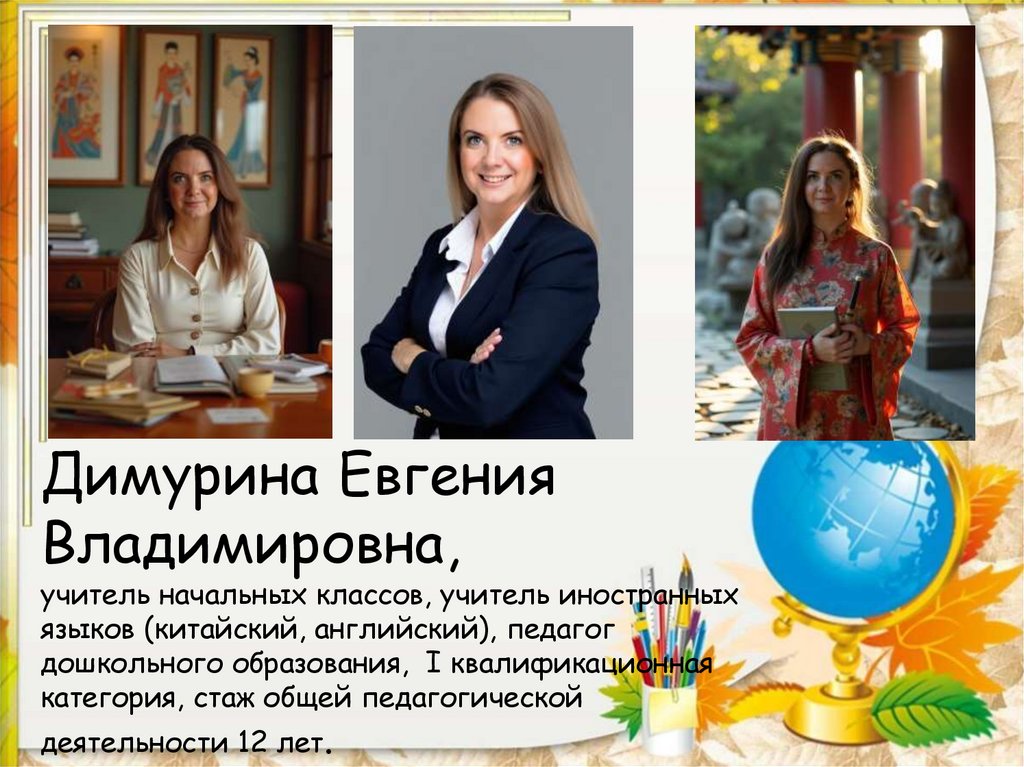 Образование6. Димурина Евгения Владимировна, учитель начальных классов, учитель иностранных языков (китайский, английский), педагог
