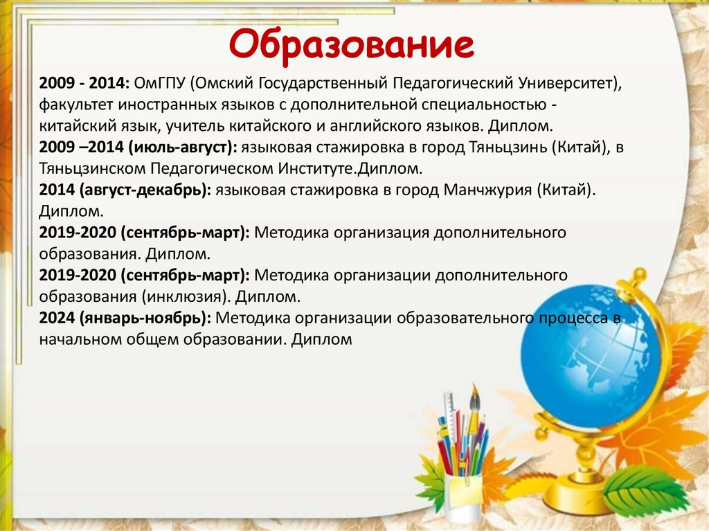 2009 - 2014: ОмГПУ (Омский Государственный Педагогический Университет),факультет иностранных языков с дополнительной специальностью китайский язык, учитель китайского и английского языков. Диплом.