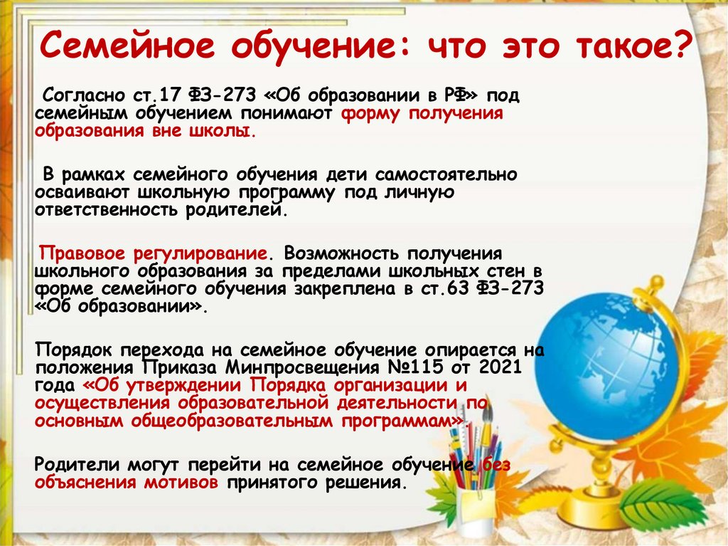форме семейного обучения закреплена в ст.63 ФЗ-273