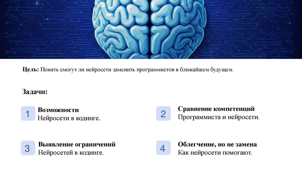 Цель: Понять смогут ли нейросети заменить программистов в ближайшем будущем.Задачи: