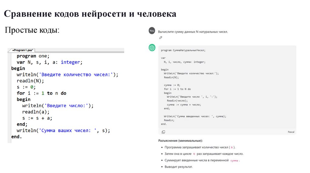Сравнение кодов нейросети и человекаПростые коды: