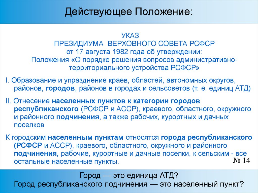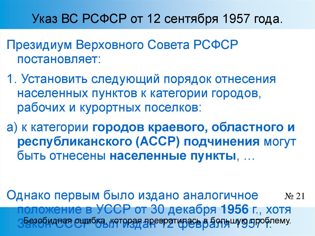 РСФСР от 12 сентября 1957 г. «О порядке отнесения населенных