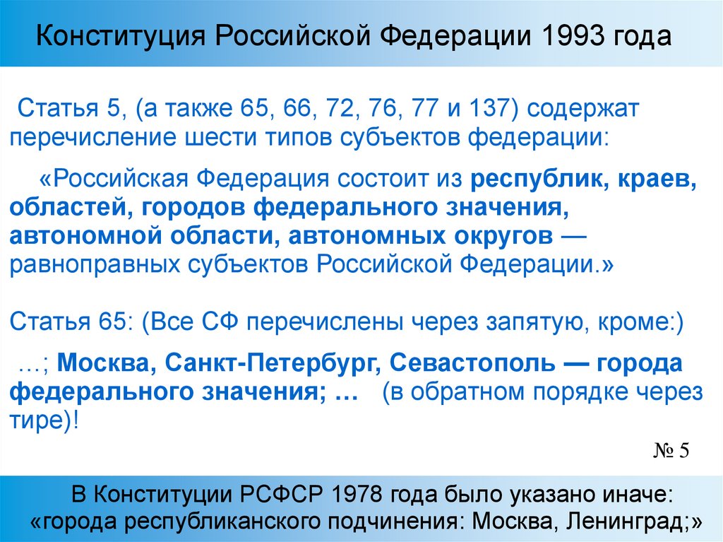 Конституция Российской Федерации 1993 годаСтатья 5, (а также 65, 66, 72, 76, 77 и 137) содержат