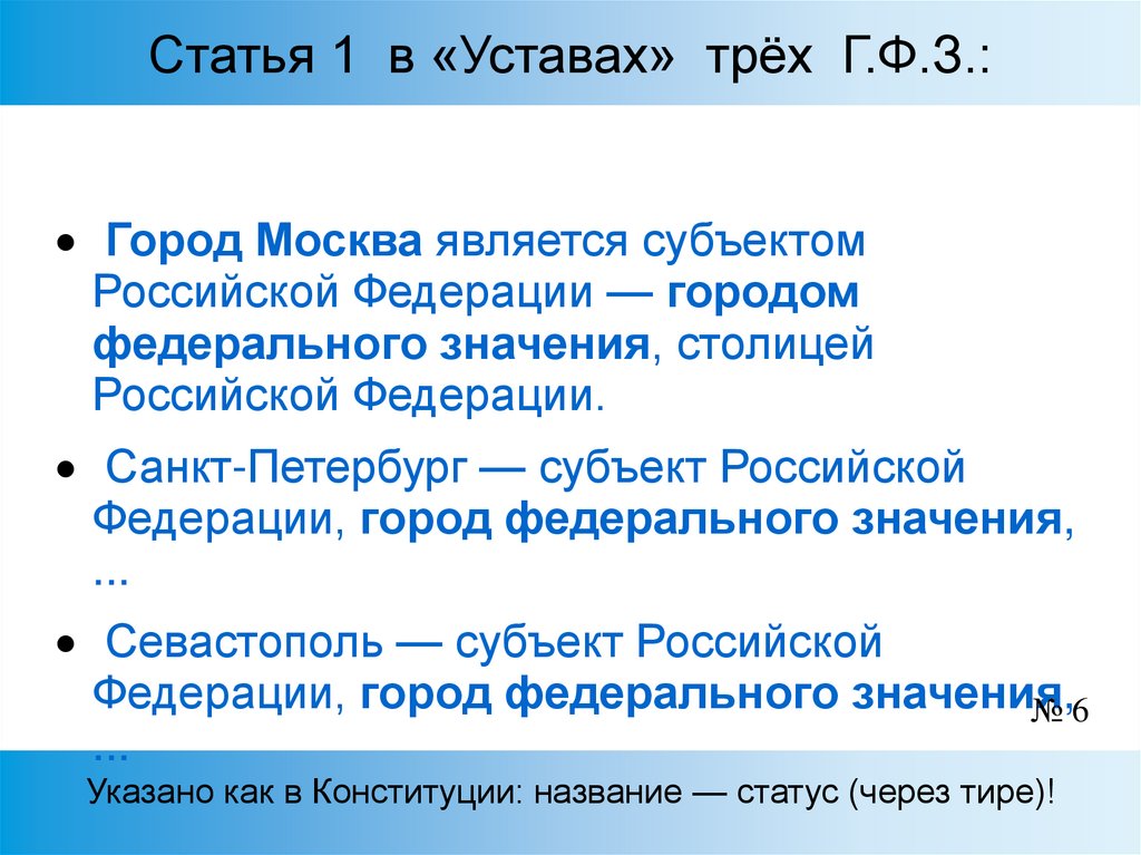 Статья 1 в «Уставах» трёх Г.Ф.З.:Город Москва является субъектом