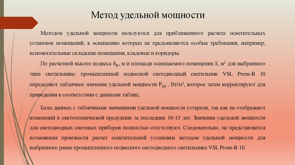 Метод удельной мощностиМетодом удельной мощности пользуются для приближенного расчета осветительных